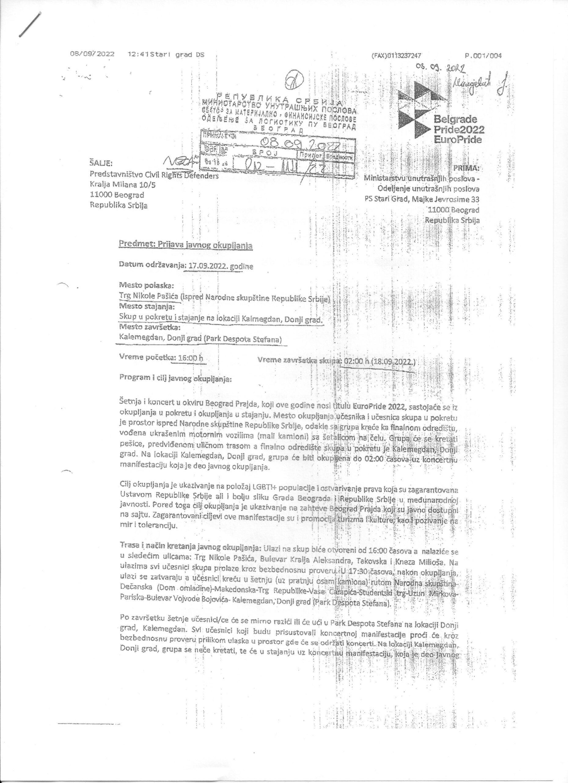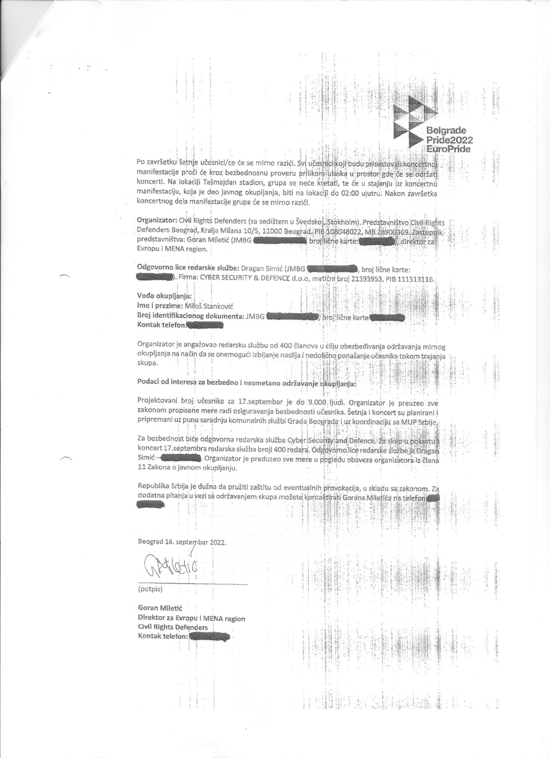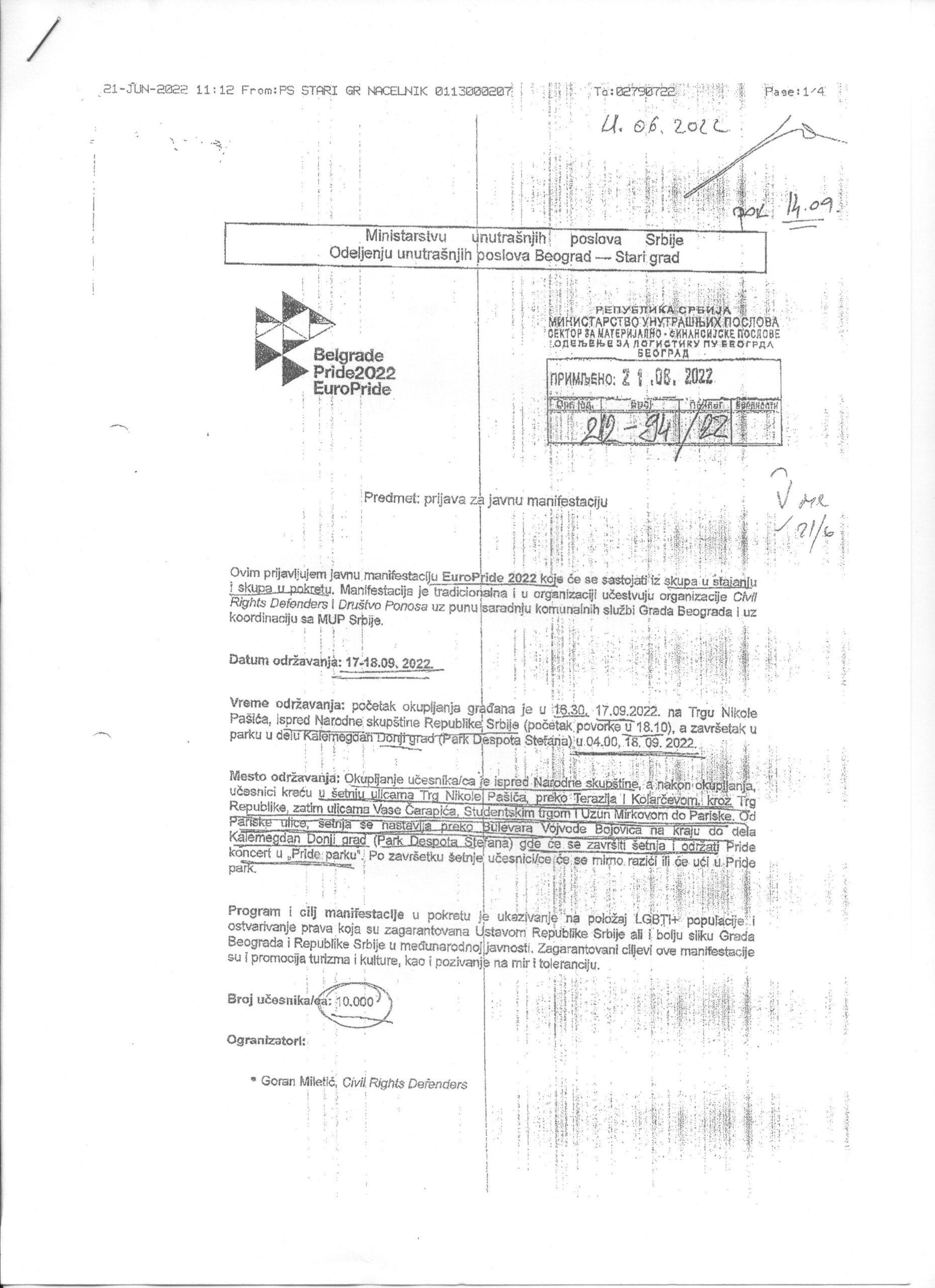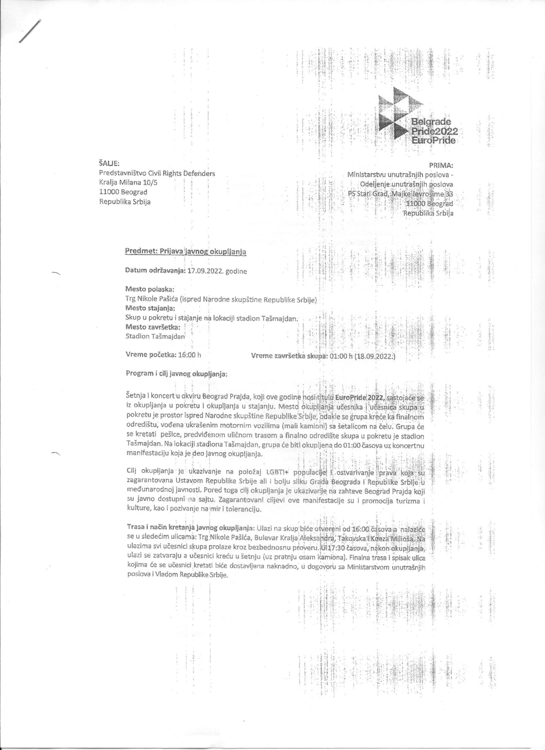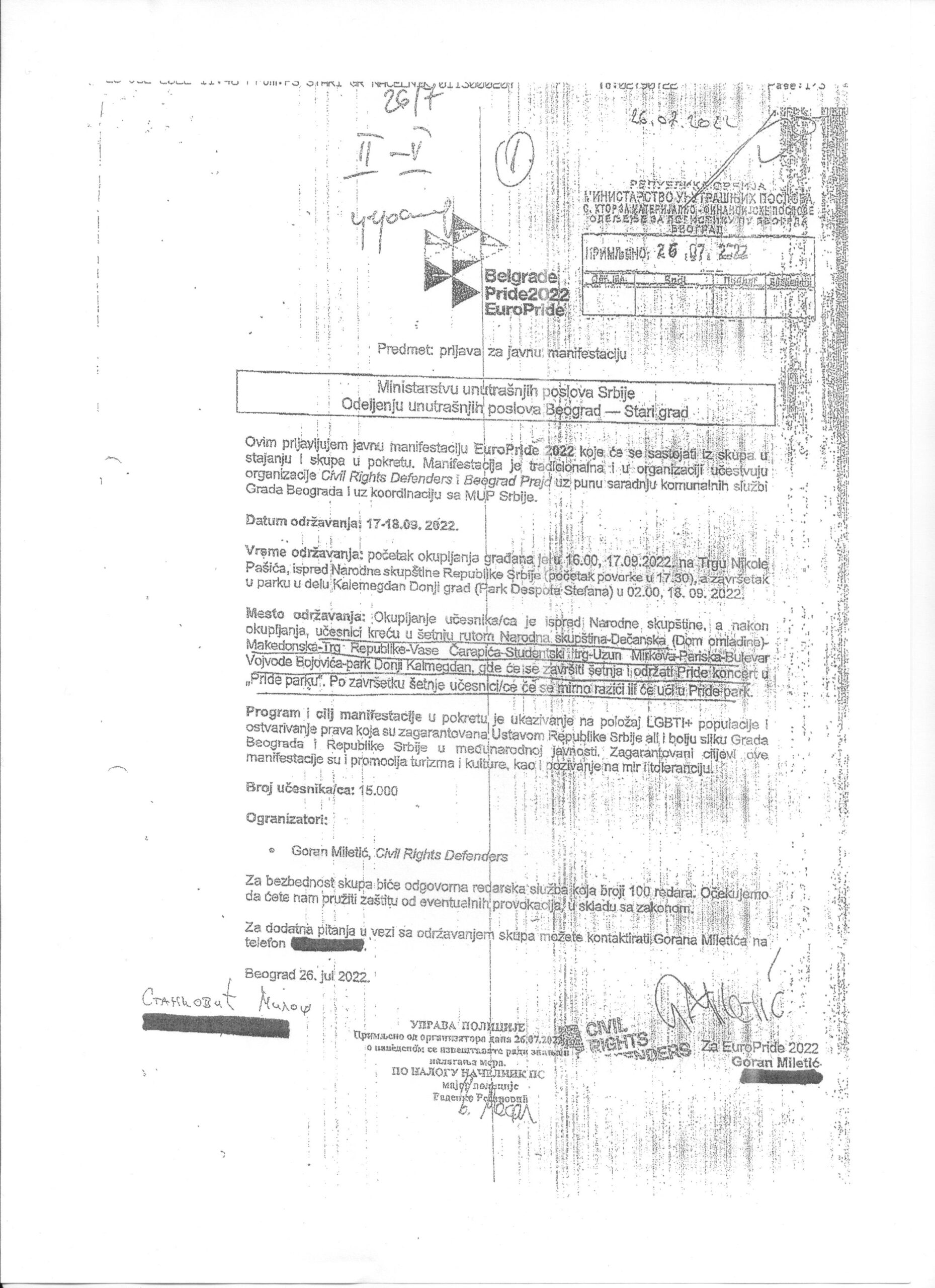U prvoj prijavi koja je primljena 21. juna 2022. godine kao organizatori su navedeni Goran Miletić iz Civil Rights Defendersa i Marko Mihailović iz Društva ponosa. U prijavi piše da prijavljuju javnu manifestaciju EuroPride 2022 koja će se sastojati iz skupa u stajanju i skupa u pokretu. Manifestacija je tradicionalna i u organizaciji učestvuju organizacije Civil Rights Defenders i Društvo ponosa uz punu saradnju komunalnih službi Grada Beograda i uz koordinaciju sa MUP Srbija.