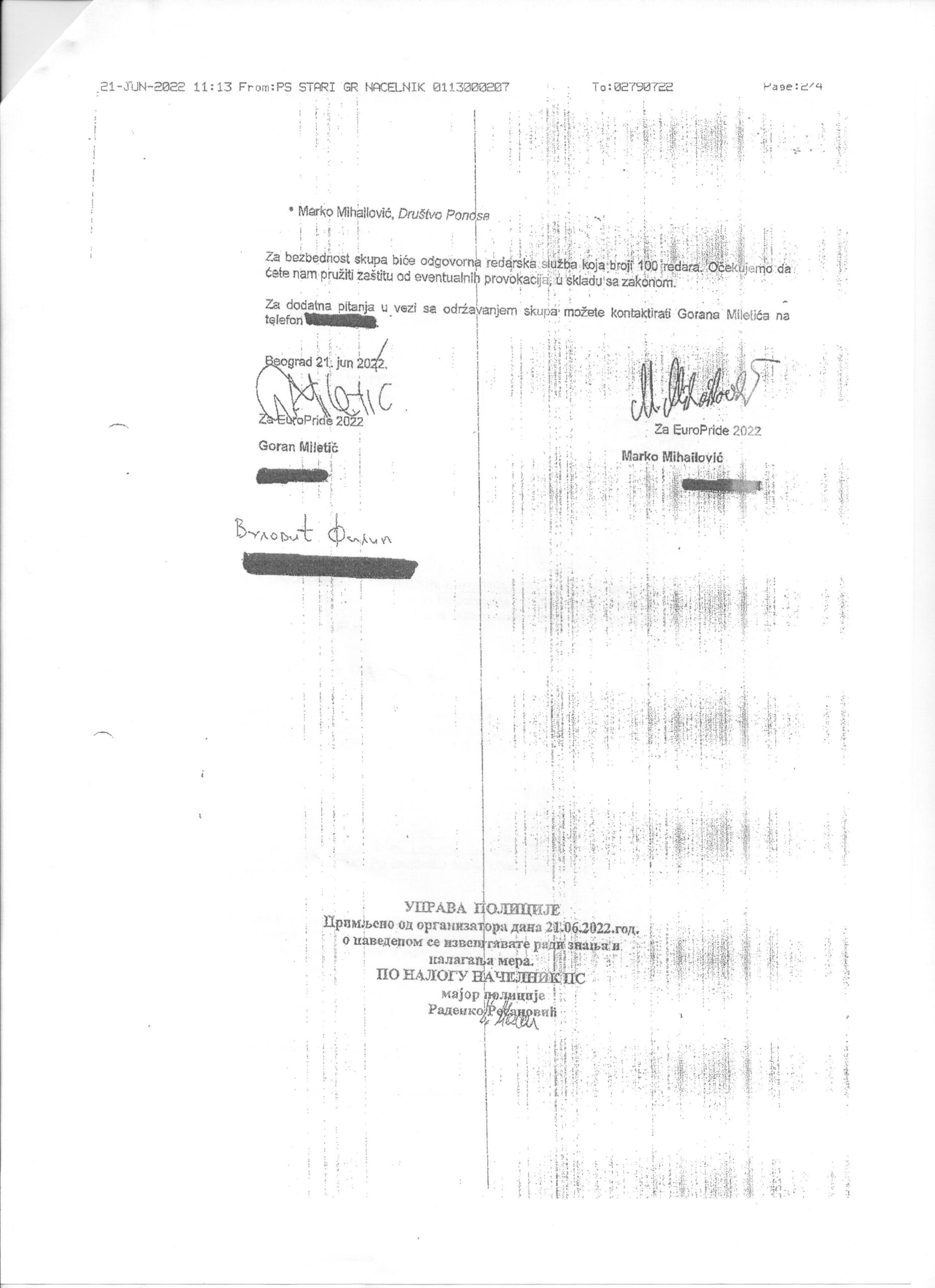 Kako piše u prijavi, za bezbednost skupa biće odgovorna redarska služba koja broji 100 redara. Prijavu potpisuju Goran Miletić, Marko Mihailović i Filip Vulović.