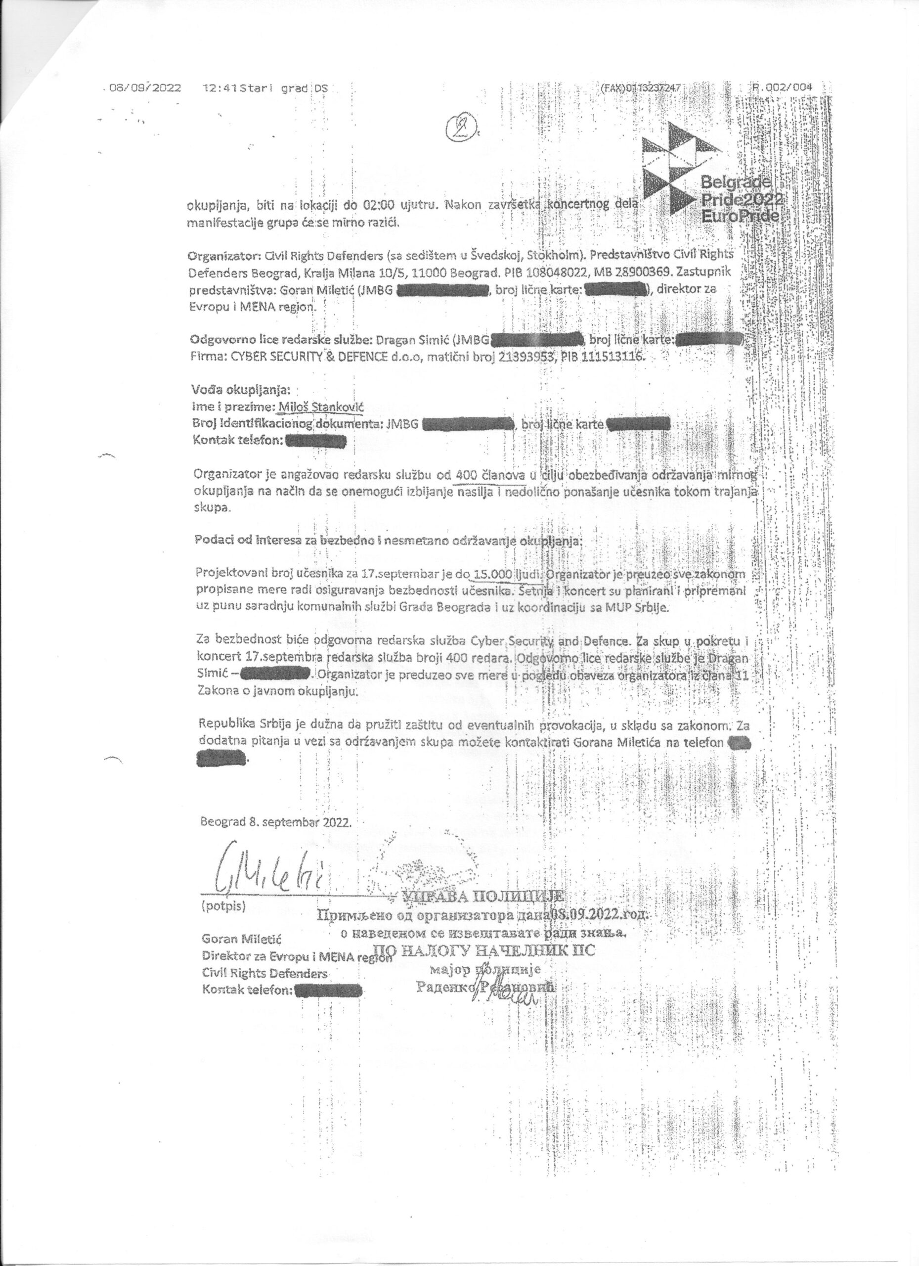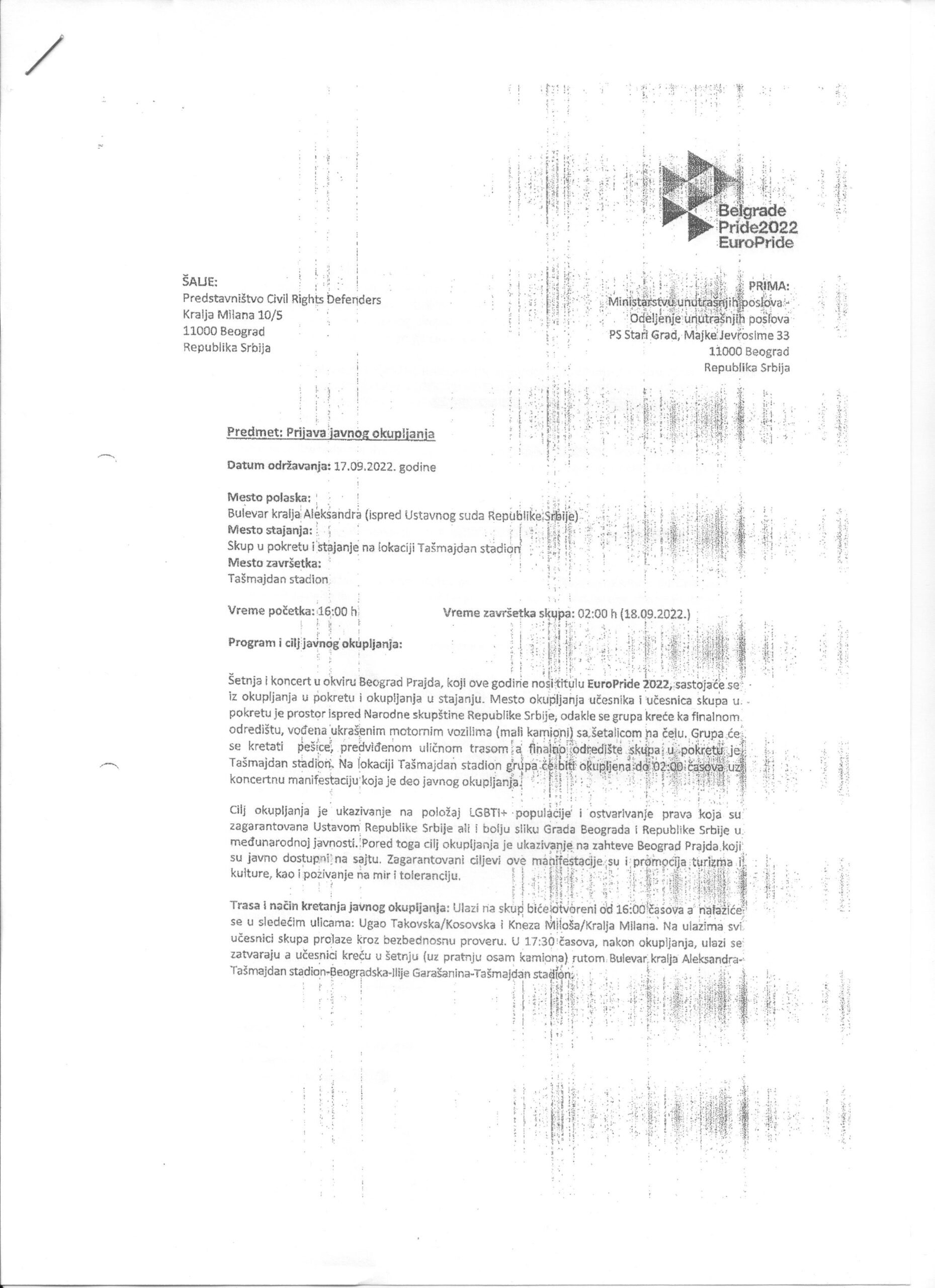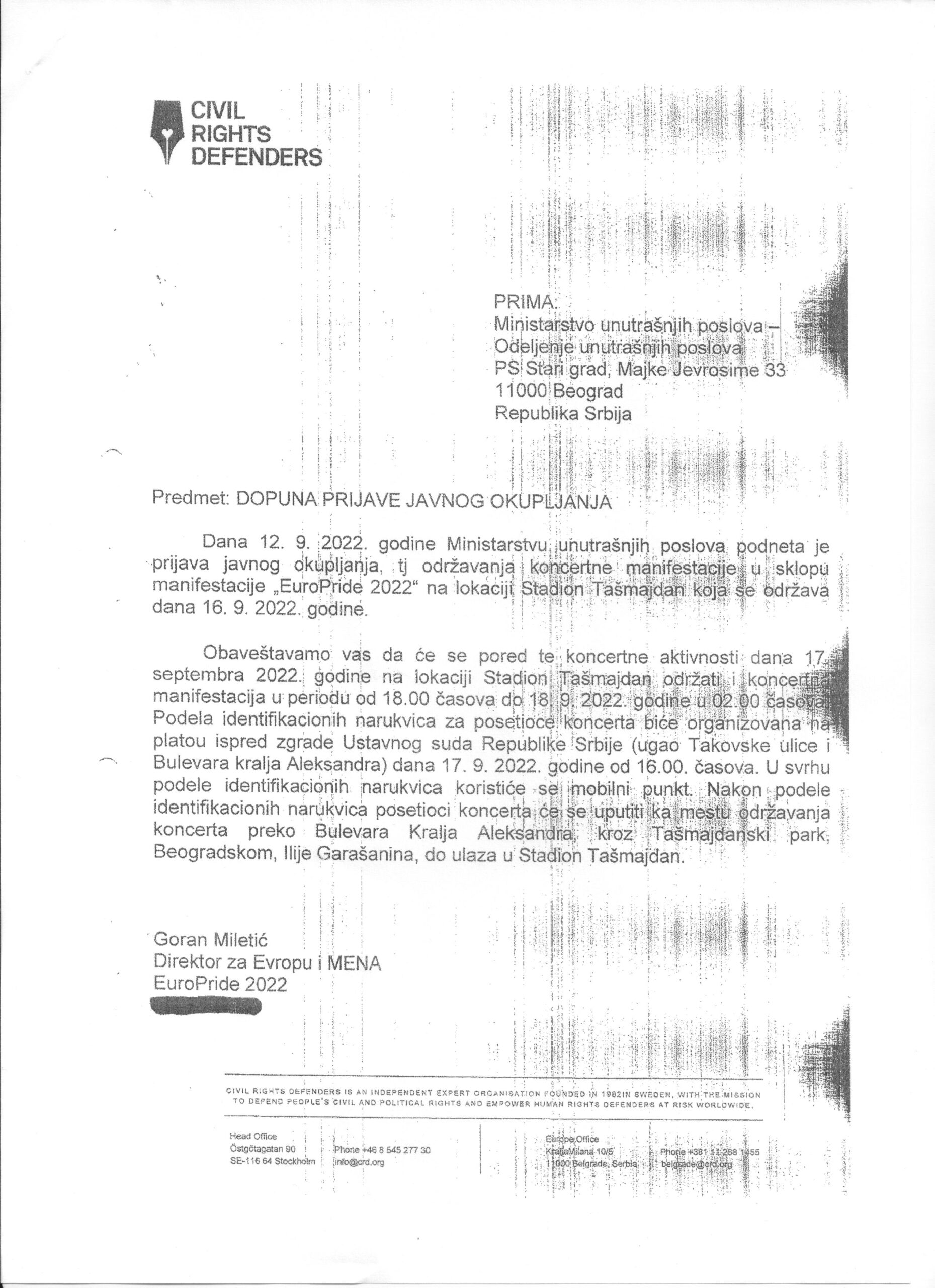Usledila je dopuna prijave koja nema naveden datum kada je poslata. U njoj piše da se Ministarstvo unutrašnjih poslova obaveštava da pored koncertne manifestacije u sklopu EuroPride 2022 na lokaciji Stadion Tašmajdan koja se održava 16. septembra, organizuje i koncertna aktivnost 17. septembra na istoj lokaciji u periodu od 18 časova do 2 časa 18. septembra. Podela identifikacionih narukvica za posetioce koncerta biće organizovana na platou ispred zgrade Ustavnog suda Republike Srbije dana 17. septembra od 16 časova. Nakon podele narukvica posetioci koncerta će se uputiti ka mestu održavanja koncerta preko Bulevara Kralja Aleksandra, kroz Tašmajdanski park, Beogradskom ulicom, Ilije Garašanina, do ulaza u Stadion Tašmajdan.