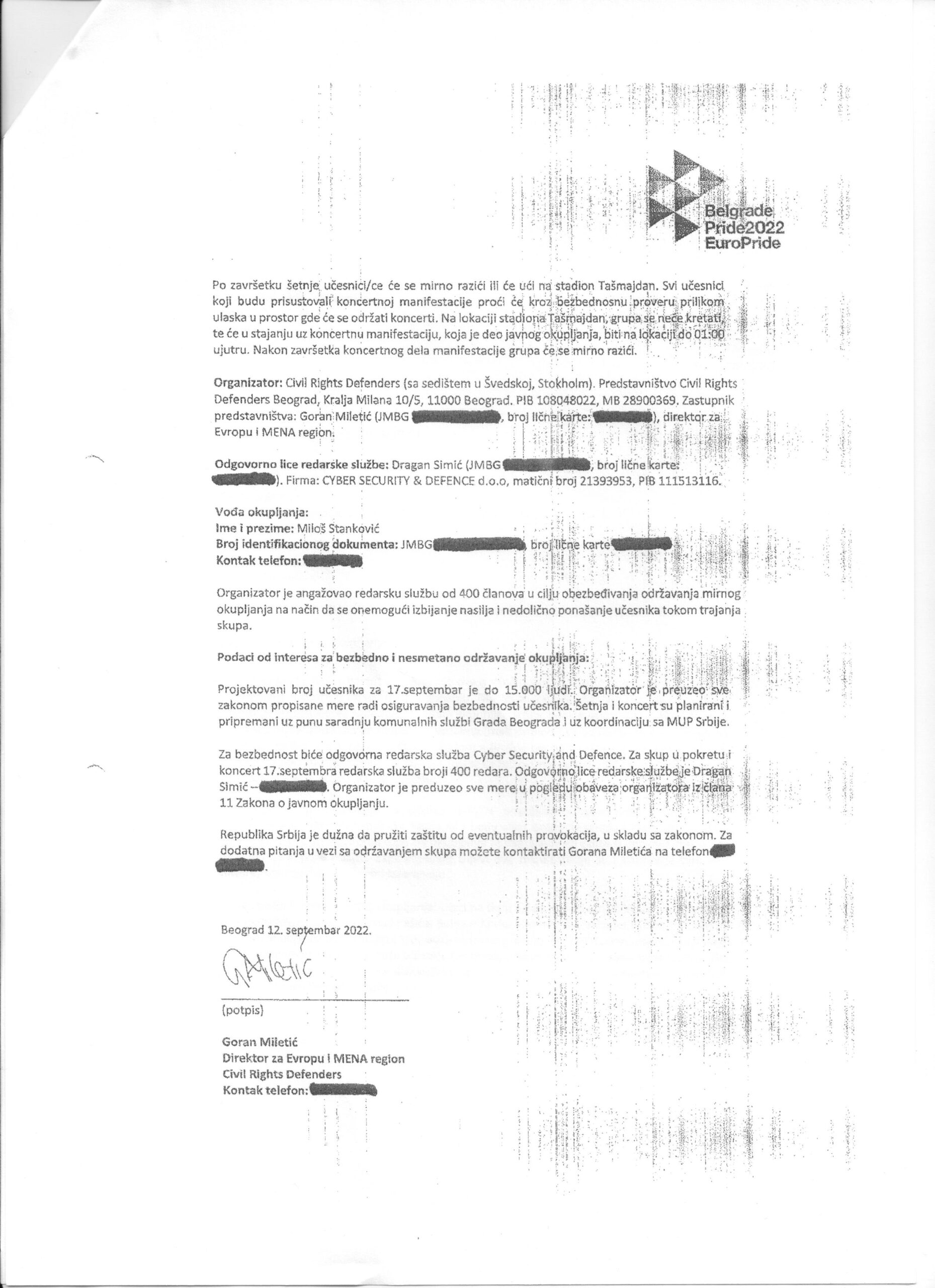 GayEcho portal je došao u posed svih prijava prošlogodišnjeg EvroPrajda koji je bio zakazan za 17. septembar 2022. godine, ali „zabranjen“ od strane Ministarstva unutrašnjih poslova Srbije.
