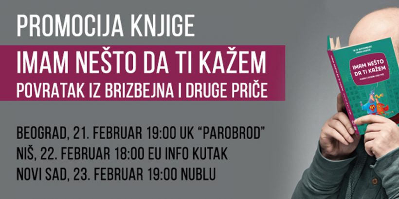 Knjiga ?e se besplatno deliti posetiocima promocija koje ?e biti organizovane u utorak 21. februara u 19 ?asova u Ustanovi kulture „Parobrod“ u Beogradu (Teatar hol na prvom spratu), 22. februara u 18 ?asova u EU info kutku u Nišu i 23. februara u 19 ?asova u kafe knjižari „Nublu“ u Novom Sadu.